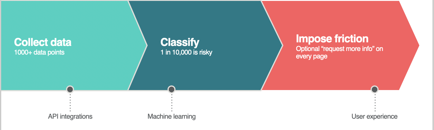 - Yellow: medium risk, an intervention needed, such as a user-facing intervention like asking for a verified phone number, a behind-the-scenes API call or manual human review.
