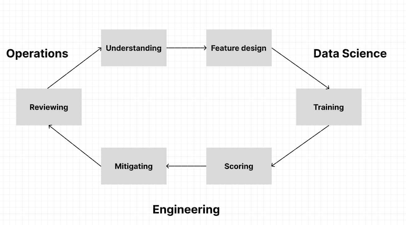 Fighting fraud is an ongoing process. It also requires the collaboration of many different teams: operations, data science, engineering, product, etc. Here's how it typically goes: (1) It all starts with understanding. The operations team are the front-line workers. They spot fraud patterns day-to-day and understand what's really happening. (2) Operations will hand these insights to the data science team to design features that can be used to predict fraudulent behavior. The data science team will also train machine learning models that we can use to score activity that's happening. (3) The engineering team is the one that runs these models in production. The engineering team is also responsible for mitigating things when something is deemed to be high-risk. (4) In certain cases we'll ask the operations team to review the decisions that we've made. As they are reviewing these patterns they'll get a better understanding of what's happening on the platform.
