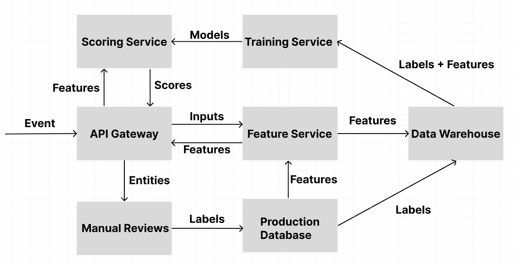 It all started with either synchronous calls to the risk gateway service or asynchronous Kafka events. The first thing it needed to do was to collect features to make a prediction. So it would call the feature service (we had to get hundreds and thousands of features quickly and efficiently). The feature service would gather features from online and offline data storage or services and when it returns the feature values it would also log those in the data warehouse. The feature values would then get sent to the scoring or online inference service. The scoring service would then produce a model score. If the score is high enough, then the entity (account, transaction, message) can get challenged, suspended, or sent for a manual review. The answers for those manual reviews would get stored in the production database as labels. Those labels would then be exported to the data warehouse. Now all the ground truth needed to train the model lived in the data warehouse. The training service would produce a model that we would then upload to the model service.