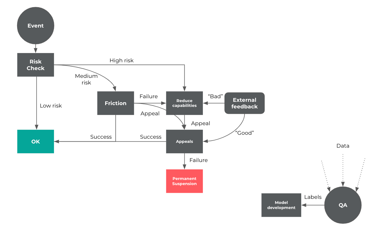- Red: high risk, which usually required a reduction of the user's capabilities to minimize further risk. This could be a spectrum: from something lightweight (e.g., slow down the user payout), to pausing certain capabilities (the user can’t change their linked bank account), to suspending the account altogether.