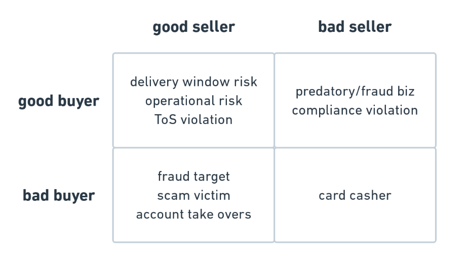 - Good seller + bad buyer meant fraudulent transactions on good merchants. The most common example of this is bad actors leveraging stolen credit card data to buy (and resell) high-value goods (say, Apple products).