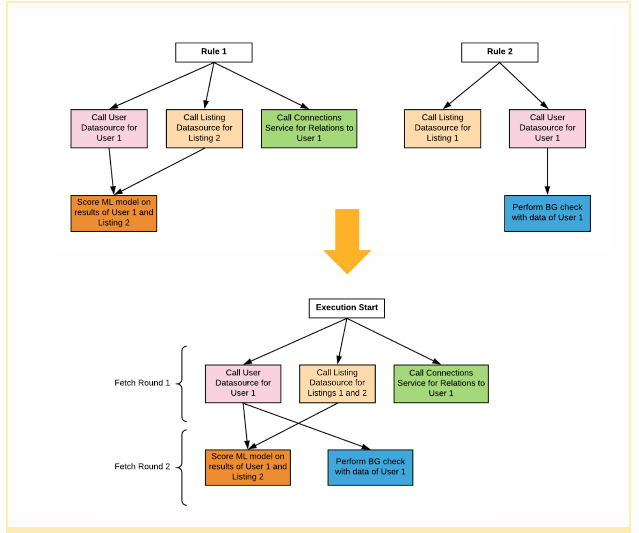 In order to solve this, we used a Haxl-like monad, we call Fetch, to provide concurrent access to data points from our rules. From a rule author’s perspective, a Fetch represents a value that will be available at some point in the future. Internally, however, Fetch constructs a dependency graph between requested data points and concurrently fetches them from their data sources. Fetch also provides caching of the accessed data to ensure that different rules issuing the same requests are receiving the same results. A sample rule fetching data about a user and a listing and then scoring an ML model might look something like:
