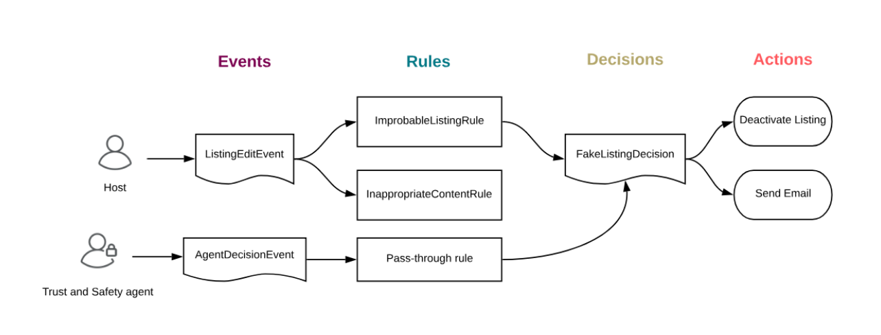 When an event reaches the system, it is then evaluated by rules. These rules accept an event as input to make a determination and output a decision. A decision is a classification of an entity (user, reservation, listing, etc) with a specific type of risk that it represents. For a fake listing, this could look like: