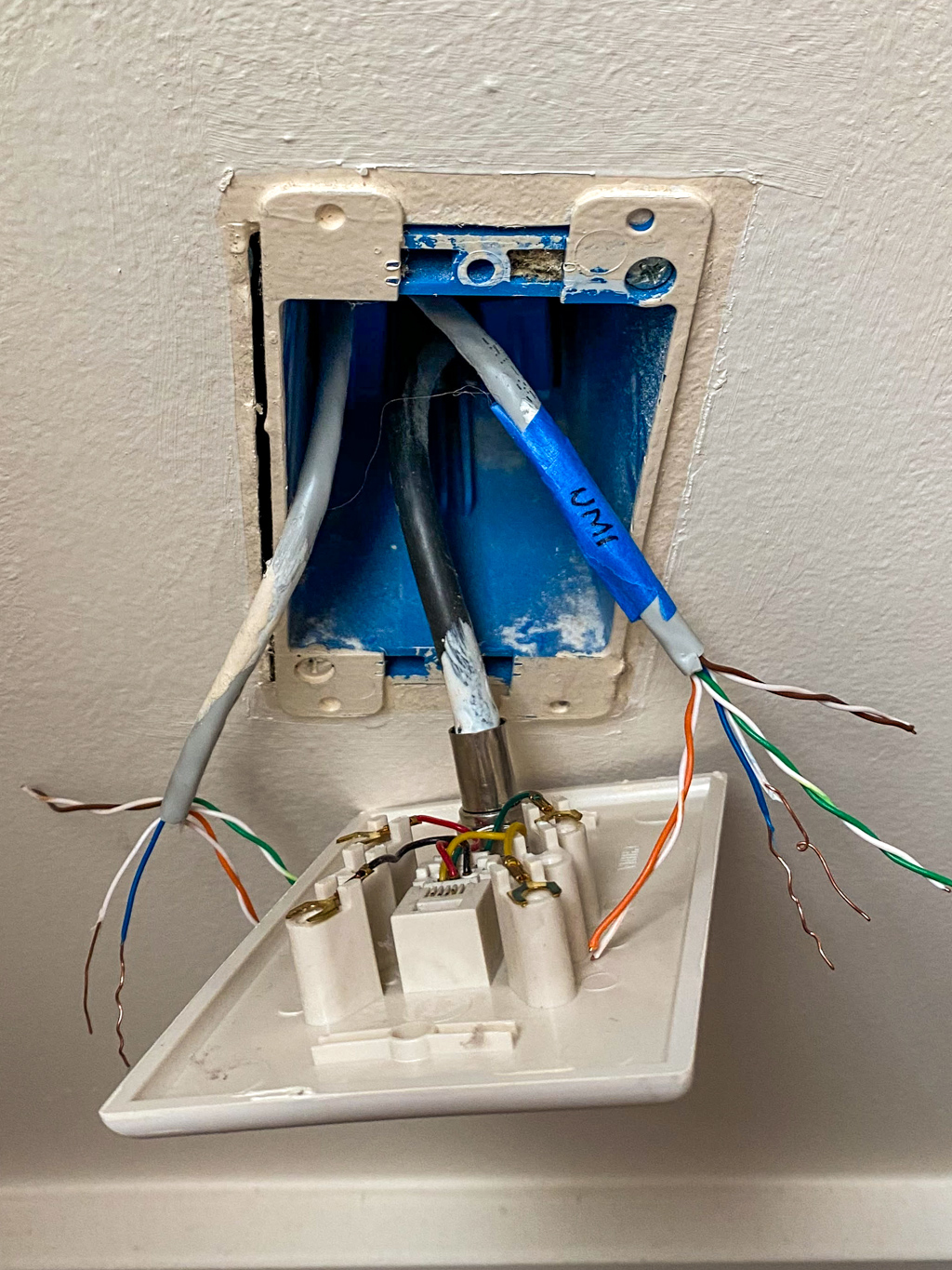 One day, while settling into our new home, I noticed something intriguing: every room had landline phone sockets (RJ14). Curious, I peeked behind these unused wall plates and discovered each one housed two Cat 5e cables.